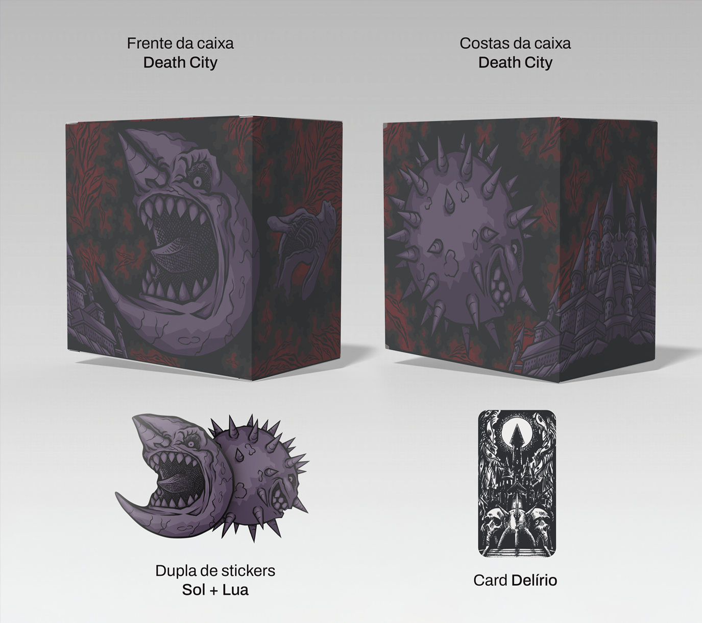 Essa peça é enviada na Caixa Death City e acompanha de brinde 1 card e a dupla de Stickers: Sol e Lua.