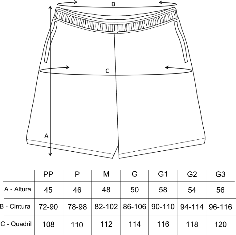 *Medidas aproximadas (variação de até 2-3 cm). As duas medidas da cintura foram tiradas considerando o elástico normal e até onde ele vai esticado.