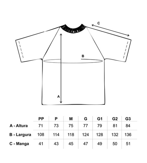 Atenção às medidas na tabela do produto, não garantimos estoque para troca de tamanho, contudo a troca poderá ser realizada por outros produtos disponíveis no site! Se tiver quaisquer dúvidas sobre o tamanho das peças, fale com a gente, vamos te orientar sobre a melhor opção de tamanho. :)