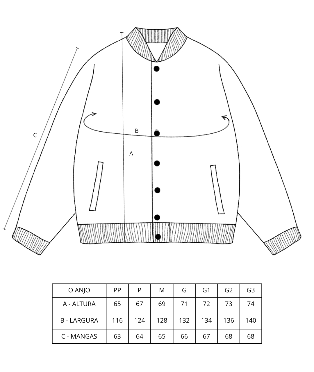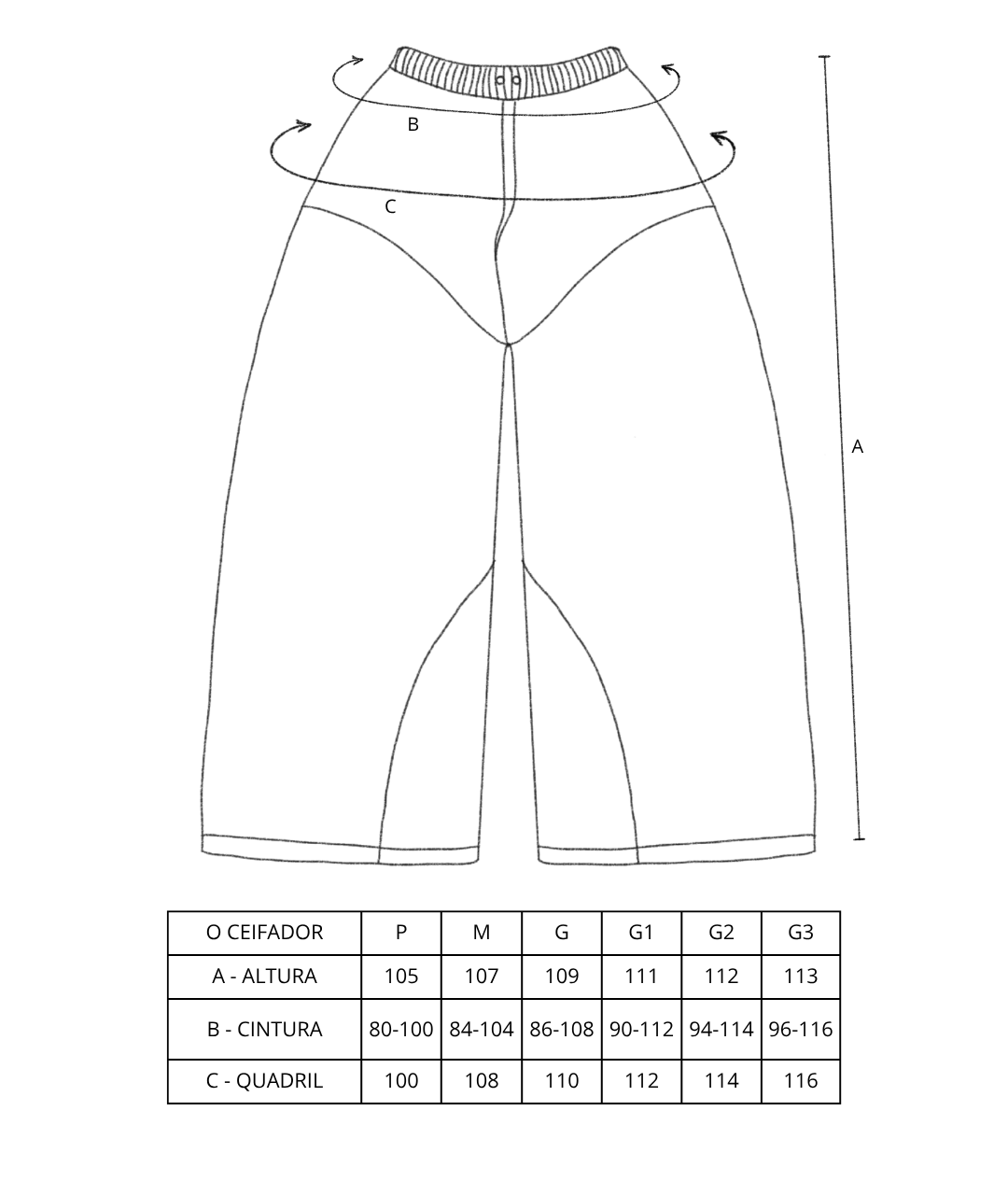 * Medidas tiradas sem esticar. Considere uma variação de 1 a 2 cm para mais ou para menos.